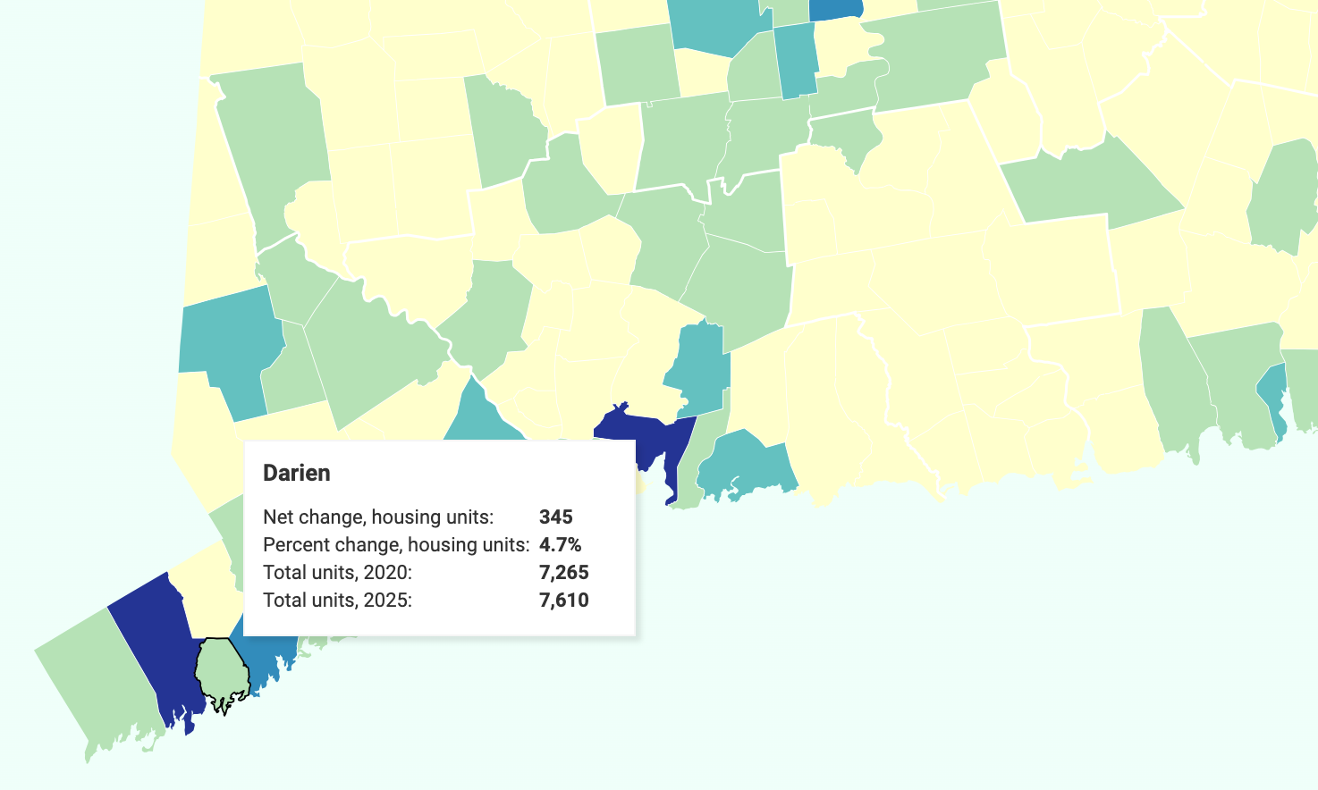 The February study from CTData Haven found that Darien has seen a 4.7% growth in its number of housing units over the past five years, which is above many neighboring communities—although the overall number of units, 345, is lower. Norwalk saw a 4.1% increase in the number of housing units it has, adding 1,564. Stamford had the highest percentage in the state—a 6.2% increase or more than 3,500 units.