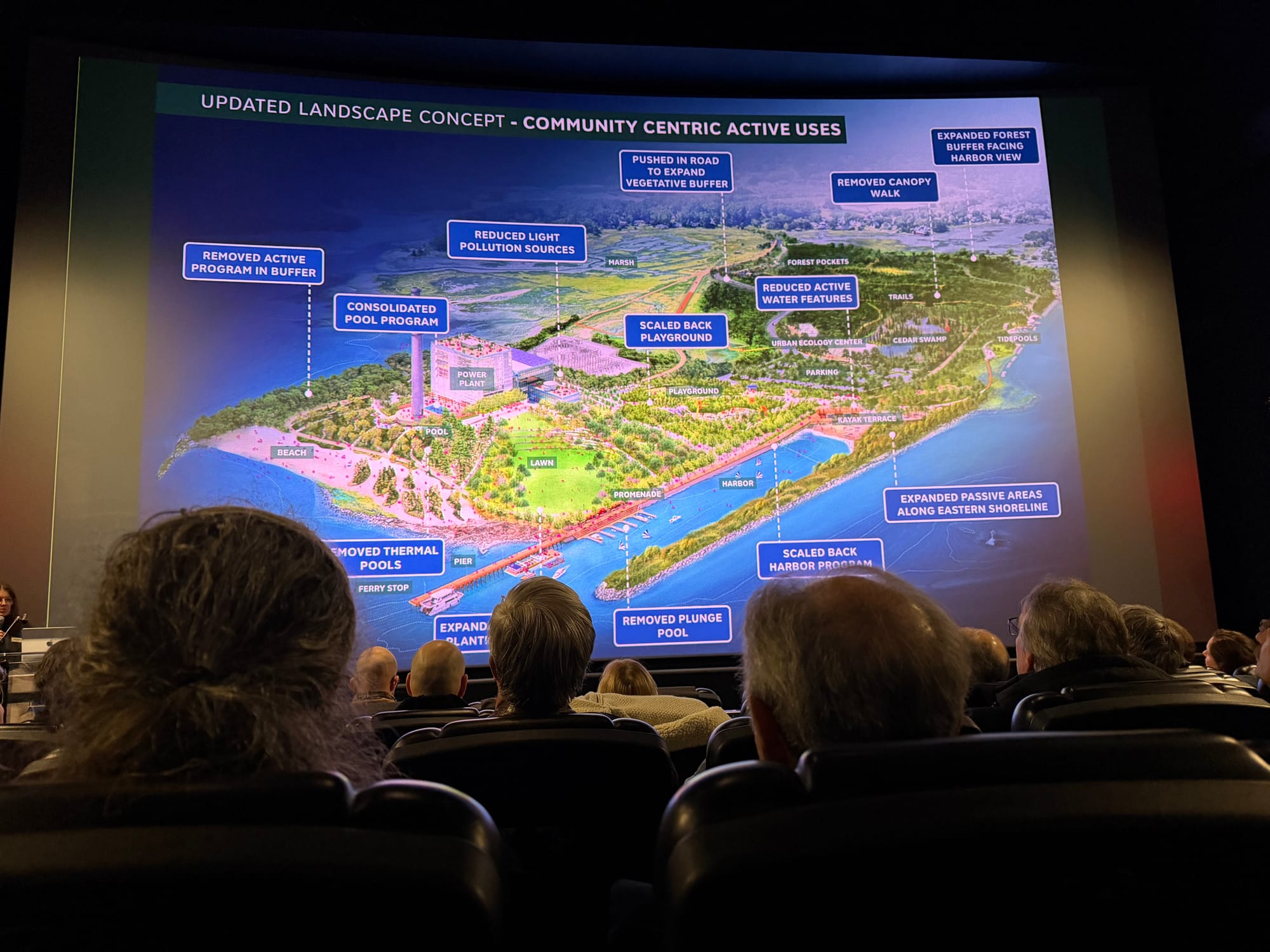 “We strongly feel that the project is better because of the input we have received from all of you—I really feel that way,” she said, adding that their core goals have remained consistent throughout. “We're going to create a beautiful park that allows people to connect to nature and the Sound. We're going to create community spaces, spaces for research and learning. And critically, we're going to take this big piece of shoreline and revitalize it so it is healthier and more resilient for people and for wildlife.”