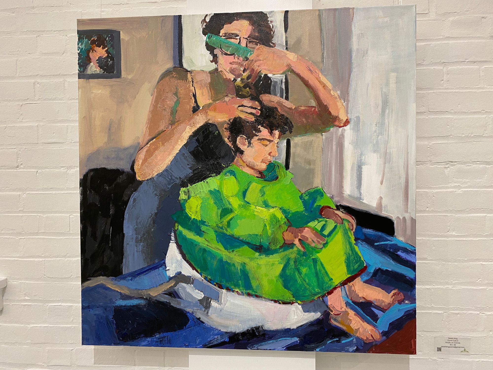 King, a painter, sculptor, and illustrator, curated the exhibit which features her own work, along with pieces from artists Maryna Bilak and Judy Glantzman. The exhibit features images that capture the everyday moments of life—from pandemic haircuts to brothers playing, mothers feeding their children to cuddling a new baby.