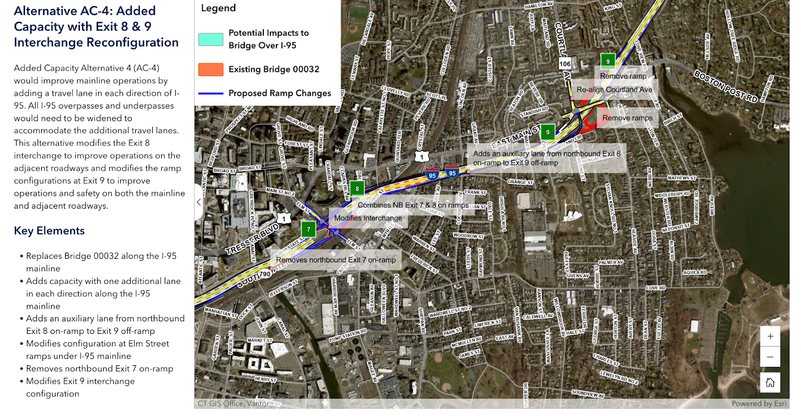 The first proposal would add an additional travel lane in both directions on I-95 through the project area. In addition, the Exit 8 interchange would be modified and “flyover” ramps to reconfigure Exit 9 would also be added. An auxiliary lane between northbound Exit 8 to Exit 9 would also be added, while a portion of South State Street would be removed and the northbound Exit 7 ramp would also be removed.