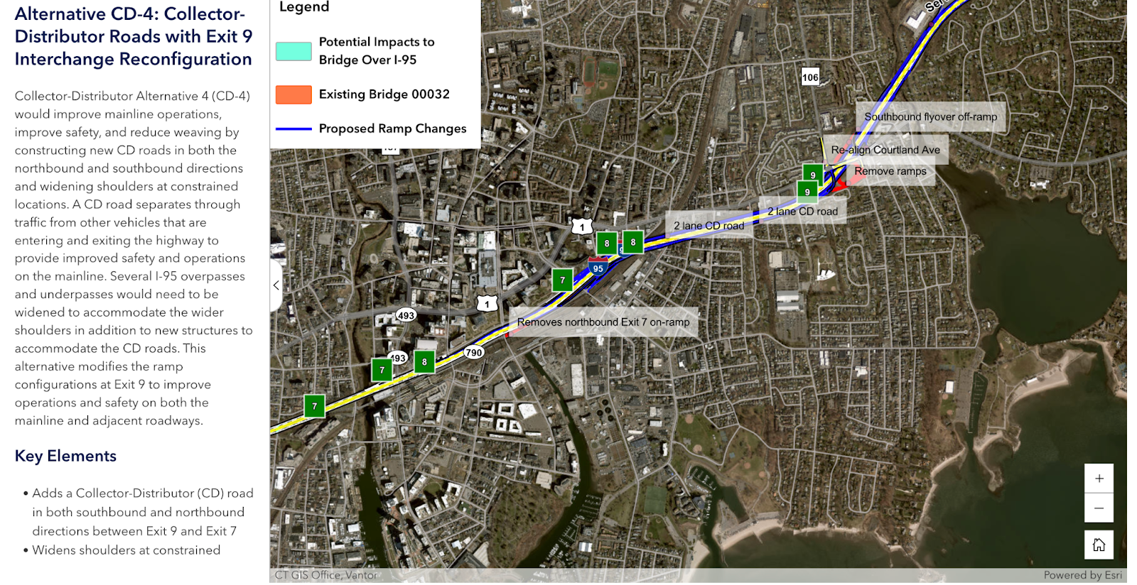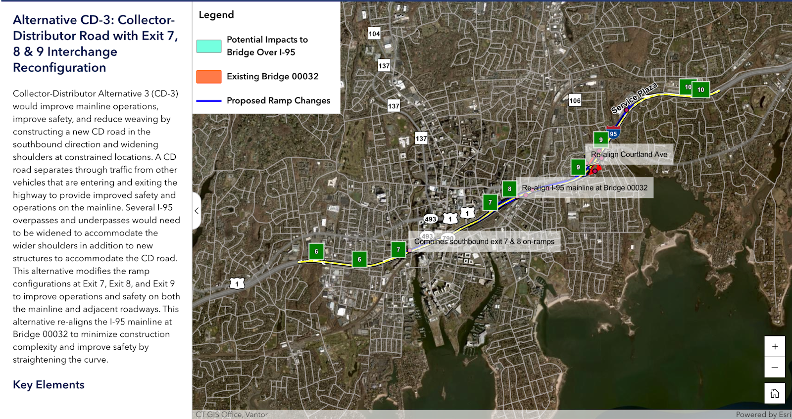 Both the third and fourth proposals would add a collector-distributor (CD) road, which would gather cars before they got onto I-95 and have them make one merge onto the highway instead of two or three at different exits.
