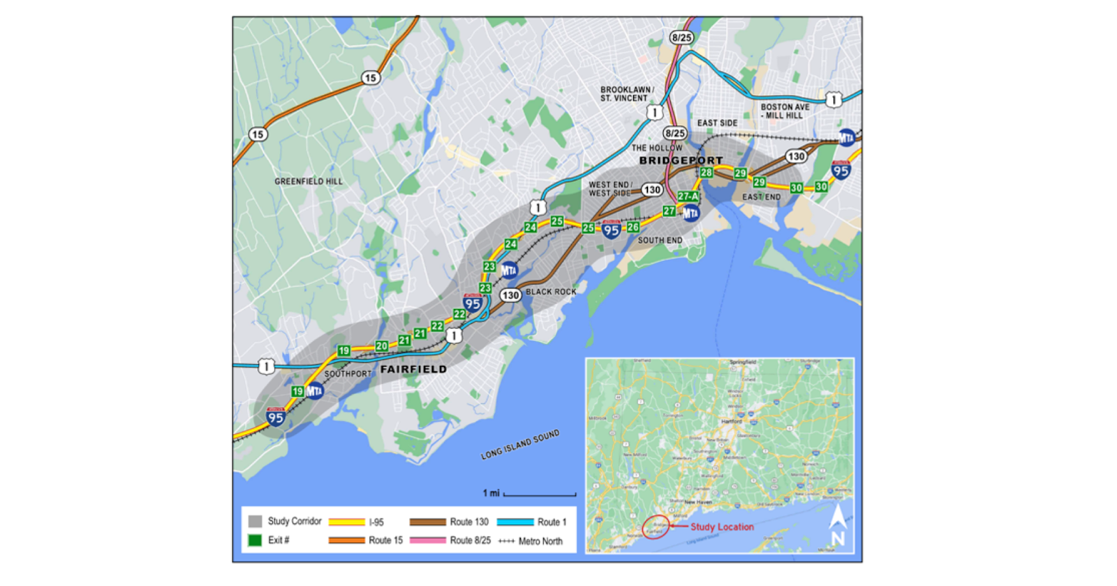 For example, the Fairfield–Bridgeport I-95 PEL found that the “system is largely deficient,” for residents looking to walk or bike on local roads in the study area, particularly along Route I and Commerce Drive/State Street in Bridgeport.