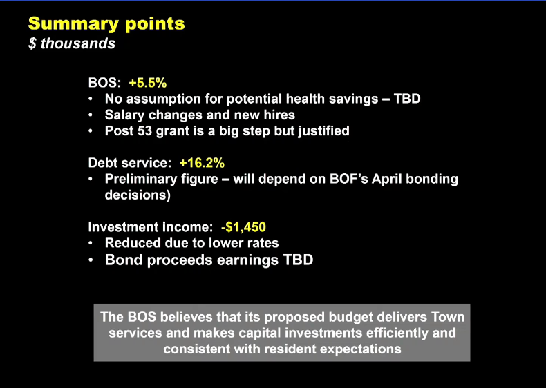 The entire town side, which includes the BOS operating budget, library costs, and the debt service fund, is up $4.8 million or an 8.2% increase for a total town budget of $63.1 million. In addition, the town is also projecting to bring in slightly less revenue from investment income, budgeting for just $2.4 million, compared to $3.9 million the year before.