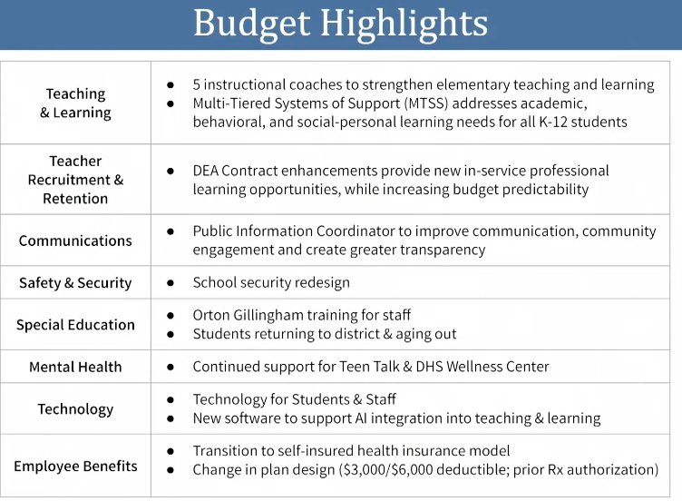 On the school side, Nelson said the budget includes funding for adding five instructional coaches at the elementary school level to help “strengthen teaching and learning.” The district is also proposing to add a public information coordinator to “improve communication, community engagement, and create greater transparency.” The budget also calls for adding new software to help support “AI integration into teaching and learning.”